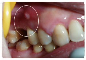 (2)慢性根尖周脓肿:多无自觉症状,在患牙的根尖区黏膜处可有瘘管,瘘管口处常有肉芽组织增生,可有脓液自瘘管排出,因有瘘管引流,不易转为急性炎症。