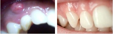 (3)根尖囊肿:多无自觉症状,牙齿变色,牙片可显示根尖部的囊肿,若囊肿增大,迫使周围骨质吸收,在患牙根尖部黏膜多呈半圆形隆起,有乒乓球感。